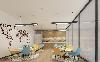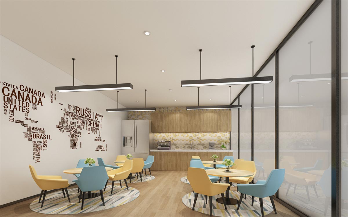 休閑區相對前面的辦公區和獨立辦公室,在裝修方面則顯得更加跳躍活潑,桌椅用活躍的黃色和舒心的青色,搭配綠色的盆栽,讓員工在工作之余可以從視覺到身心上都得到放松。