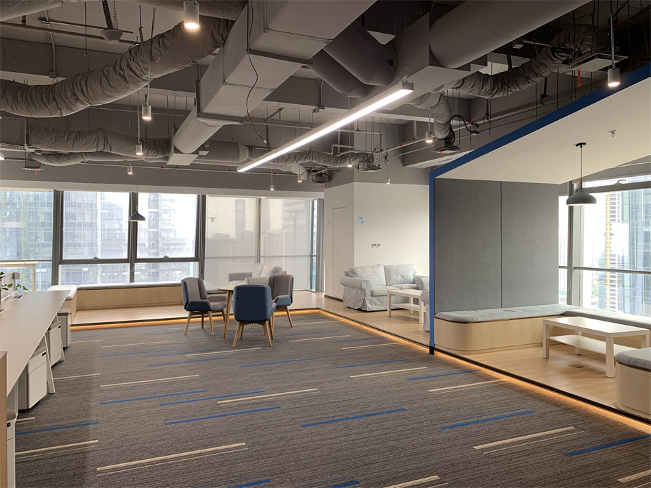 前臺采用簡潔明了的LOGO,搭配暖色系燈帶和臺面材料,打破網(wǎng)絡(luò)科技公司的刻板印象,營造一種溫馨的辦公氛圍。線條感的地毯從視覺上給人一種速度感,代表迅雷下載服務(wù)的追求。